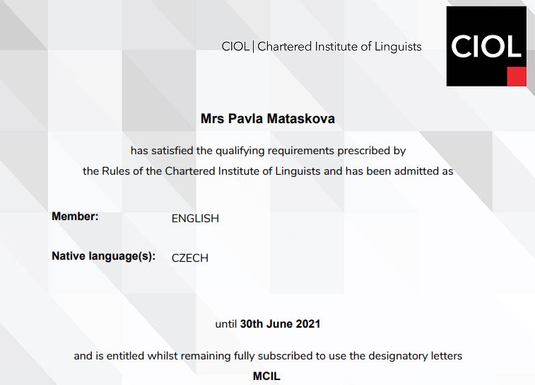 As a full member of the Chartered Institute of Linguists (CIOL number: 59710) my credentials have been checked and approved.